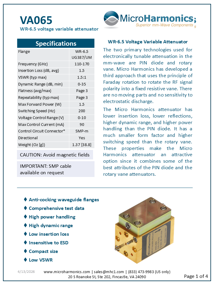 Voltage variable attenuators (VA) find wide application in many microwave and millimeter-wave systems. At frequencies above 50 GHz, most voltage variable attenuators are either based on pin diodes or resistive vanes with motor driven mechanical actuators. PIN diode attenuators are available up to the WR-6.5 band (110-170 GHz). However, the dynamic range of the WR-6.5 PIN attenuators is only 20 dB, the return loss is near 6 dB, and the power handling is only 6 mW. Transistor chip attenuators are available with good performance to 100 GHz, but the maximum power rating is only 30 mW. The chip must be mounted to a circuit and integrated into the waveguide.